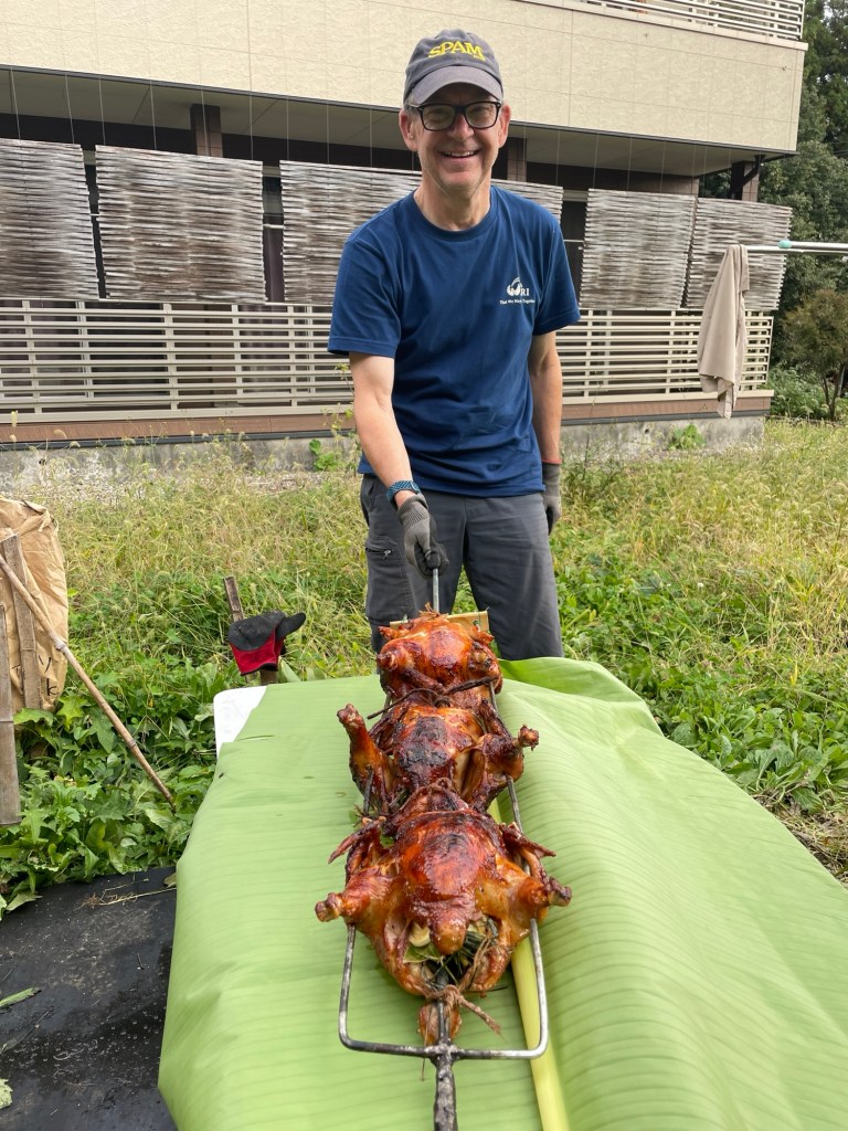 During the event Scott helped Nick and Sarah (both from the Philippines) gill pork and chicken lechón over an open fire.