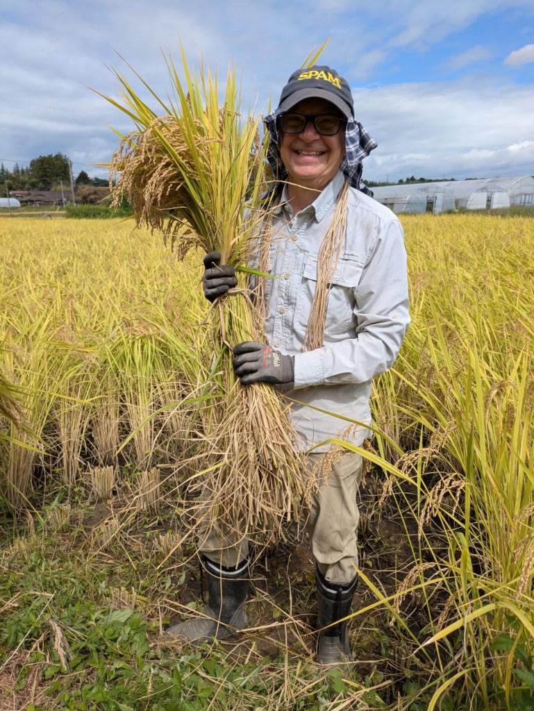 The process is to take a small sickle and cut the rice. Then it is gathered into bundles and tied with twine. (Scott and Chrys spent several hours in the prior days cutting twine to length.) The photos at the top show Chrys and Scott holding harvested bundles.